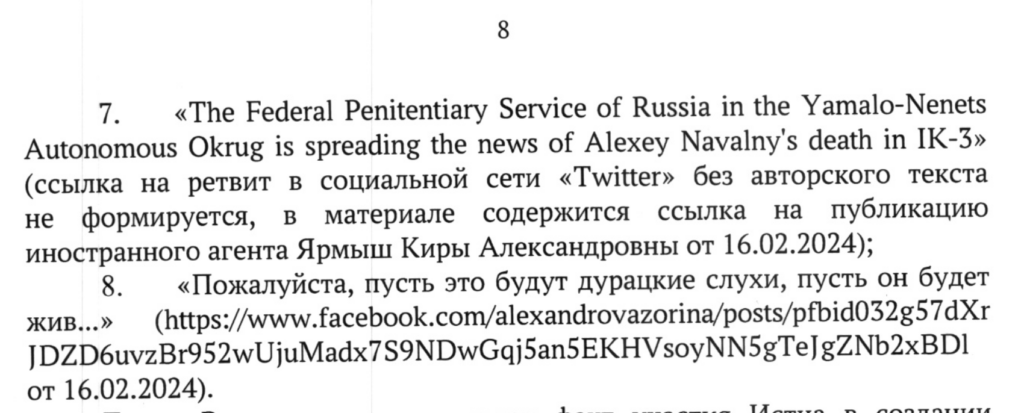 • распространение «сообщений и материалов, предназначенных для неограниченного круга лиц», в которых Александрова-Зорина, по словам Минюста, «выражает мнения о принимаемых органами публичной власти Российской Федерации решениях и проводимой ими политике, формирует общественно-политические взгляды и убеждения». В качестве примера в материалах дела представлены посты о смерти Алексея Навального и войне в Украине. Некоторые из них сейчас недоступны.
