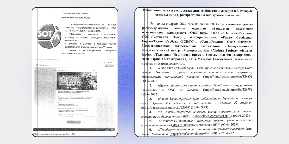 По мнению сотрудников Главного управления по противодействию экстремизму МВД, SOTA.vision находится по «иностранным влиянием», так как в 2022 и 2023 годах в телеграм-канале издания размещались «публикации с критикой в отношении руководства страны» и призывы «к участию  митингах против действующего режима в поддержку Украины». Также SOTA.vision принимала участие в распространении сообщений иностранных агентов. В качестве доказательства приводится несколько десятков скринов постов из телеграм-канала. Например, новость о том, что в Тольятти перенесли концерт Дианы Арбениной.