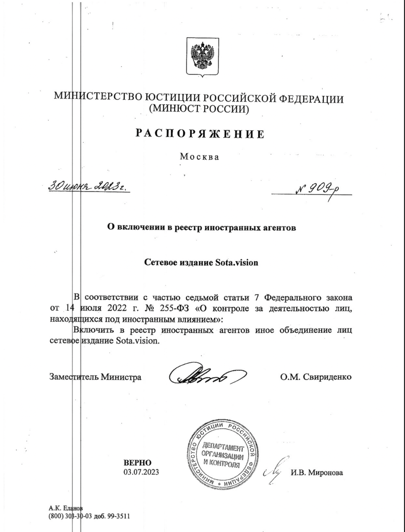 SOTAvision стало 638 «иноагентом». В качестве причины внесения в реестр указано «нахождение под  иностранным влиянием». Вместе с SOTAvision в этот день в реестр попали музыкант Борис Гребенщиков, политик Михаил Тимонов, издание «Бумага» и другие.