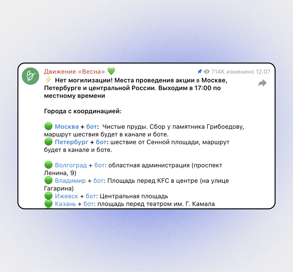 Отделения «Весны» были в разных городах России: в Петербурге, Москве и нескольких регионах. Позже у движения появилась своя диаспора в Швеции, Нидерландах, Чехии, Литве, Грузии и Финляндии.
