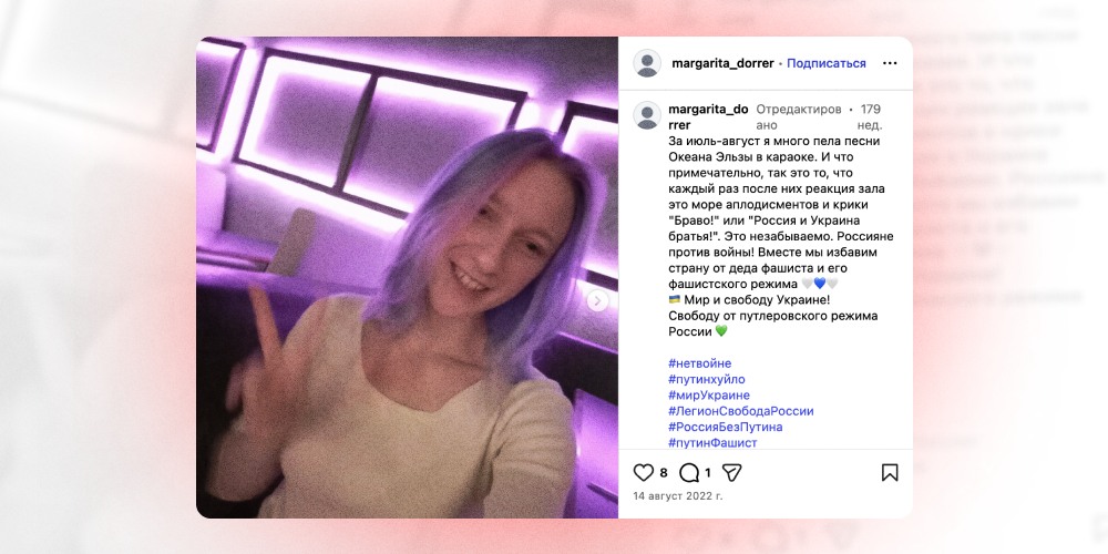 Первую встречу мы назначили в караоке, так как я люблю петь. Но когда мы пришли, Коля сказал, что там слишком шумно, а он хочет поговорить, чтобы меня было хорошо слышно. «Красных флагов» было достаточно: дрожащие руки, разговоры о ЛСР и «СВО» на первой же встрече. На всех последующих встречах он тоже постоянно меня спрашивал про ЛСР. Меня это смутило, но я не думала, что отвечать на вопросы про организации, признанные террористическими, запрещено, и поэтому отвечала. Разумеется я не знала, что он тайно ведет запись на диктофон.