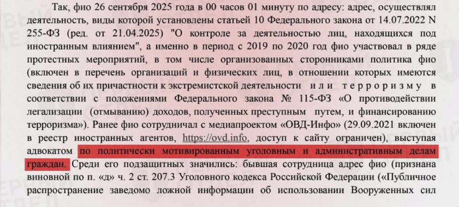 Перовский районный суд Москвы 2 февраля 2026 года оштрафовал адвоката Дмитрия Захватова по ч. 1 ст. 19.34 КоАП РФ — за недонесение на себя как на «иностранного агента». В постановлении суд указал, что Захватов сотрудничал с «ОВД-Инфо» и «выступал адвокатом по политически мотивированным уголовным и административным делам граждан».