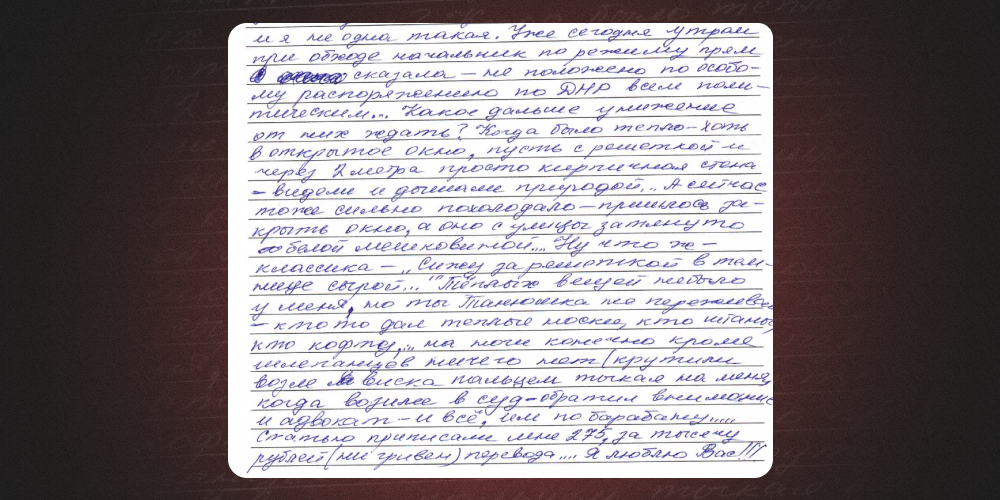 Письмо Ирины Суховей из СИЗО-1 самопровозглашенной ДНР: «Уже сегодня при обходе начальник по режиму сказала — не положено по особому распоряжению по ДНР всем политическим [посылки]. Какое дальше унижение от них ждать?» Судя по другим письмам, посылку от волонтеров позже все-таки передали.