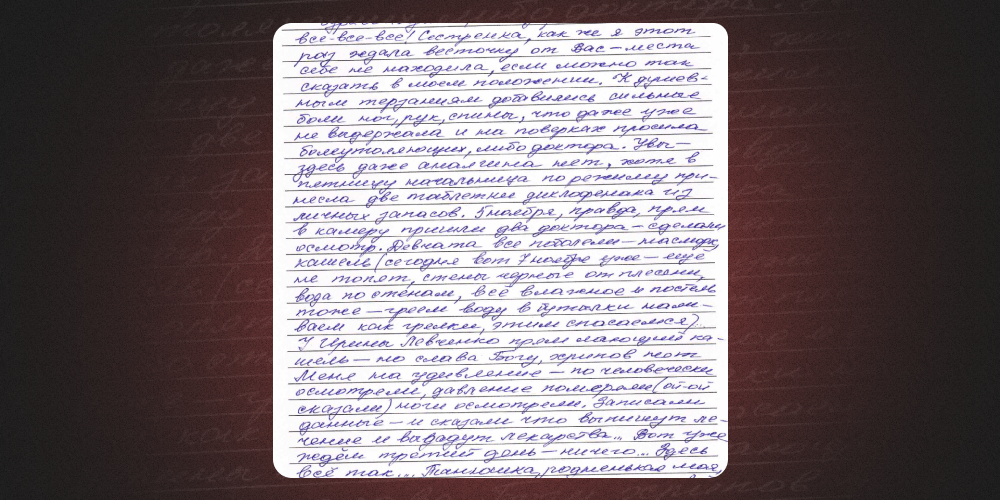 В письме сестра говорила, что в СИЗО по стенам течет вода, постели мокрые, мы все кашляем, все больные. В одном письме написала, что старшая по изолятору принесла таблетки из своих запасов, потом врачи пришли, обследовали ее, но лекарства в СИЗО передать нельзя.