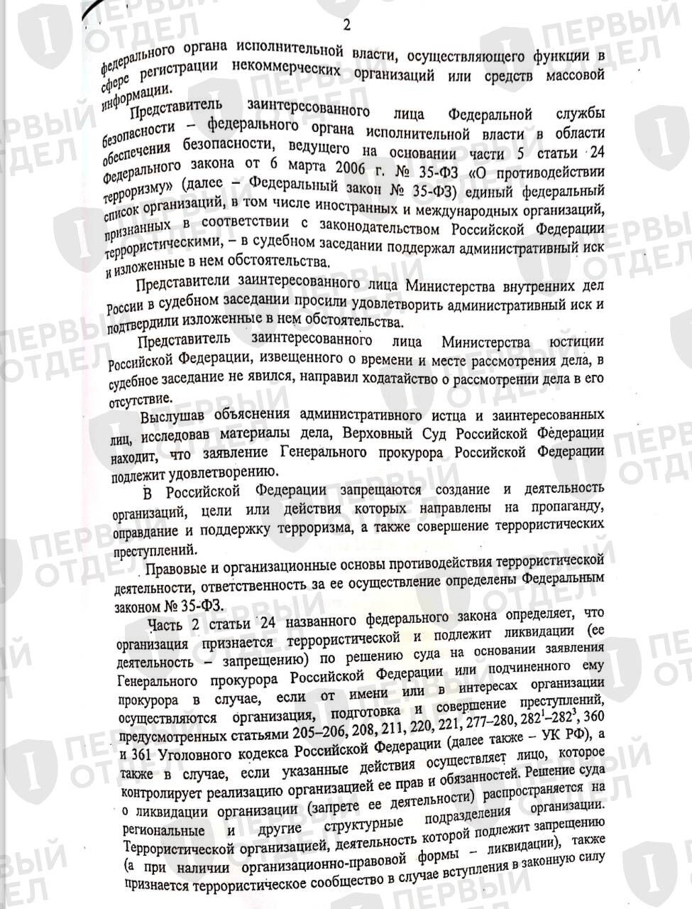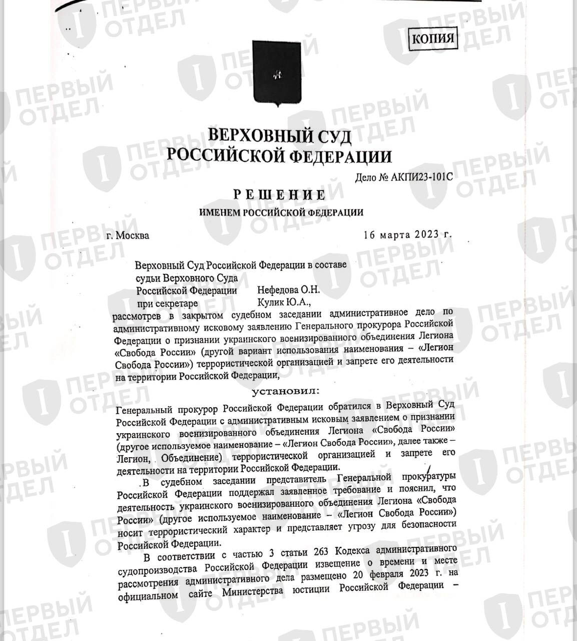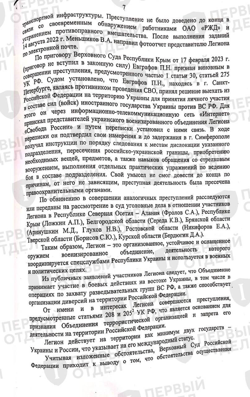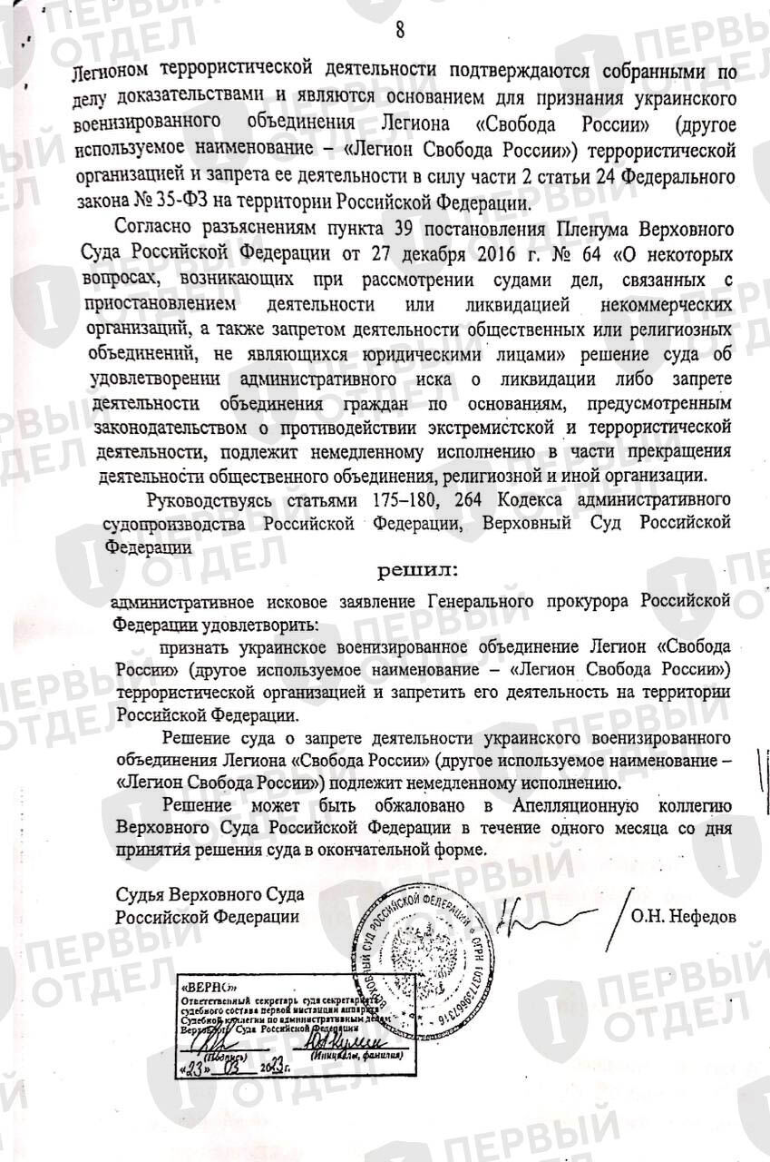 «Первый отдел» получил копию решения Верховного Суда РФ о признании «Легиона “Свобода России”» террористической организацией и его запрете на территории России. Также, как в случае с решением о признании экстремистским так называемого «Международного общественного движения ЛГБТ», Верховный Суд отказывался предоставлять документ по запросу. Получить решение позволило одно из множества уголовных дел о приготовлении к государственной измене в форме «перехода на сторону противника», в которых работают адвокаты «Первого отдела». Само заседание о запрете «Легиона» проходило в закрытом режиме, решение вынес тот же судья, что и по «делу ЛГБТ» — Олег Нефедов.