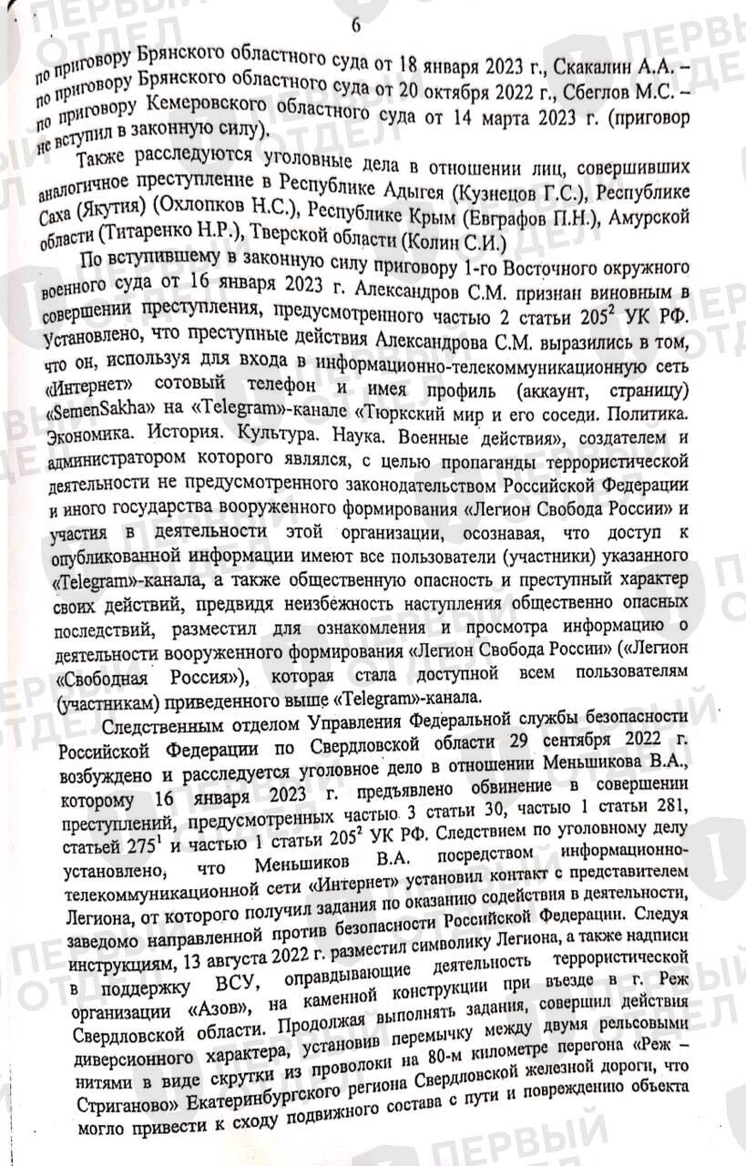 В решении Верховного Суда перечислены дела о связи с «Легионом», в которых уже вступили в силу приговоры. Среди них обращает на себя внимание дело С.М. Александрова которого осудили 16 января 2023 года по ст. 205.2 УК РФ (публичные призывы к осуществлению террористической деятельности, публичное оправдание терроризма или пропаганда терроризма) за то, что он, будучи администратором телеграм-канала «Тюркский мир и его соседи», разместил «для ознакомления и просмотра информацию о деятельности “Легиона”». Сейчас на канал подписаны 95 человек. Он не обновлялся с лета 2022 года.